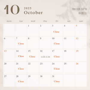 10月3日(金)休、7日(火)休、10日(金)休、14日(火)侑楽休館日、