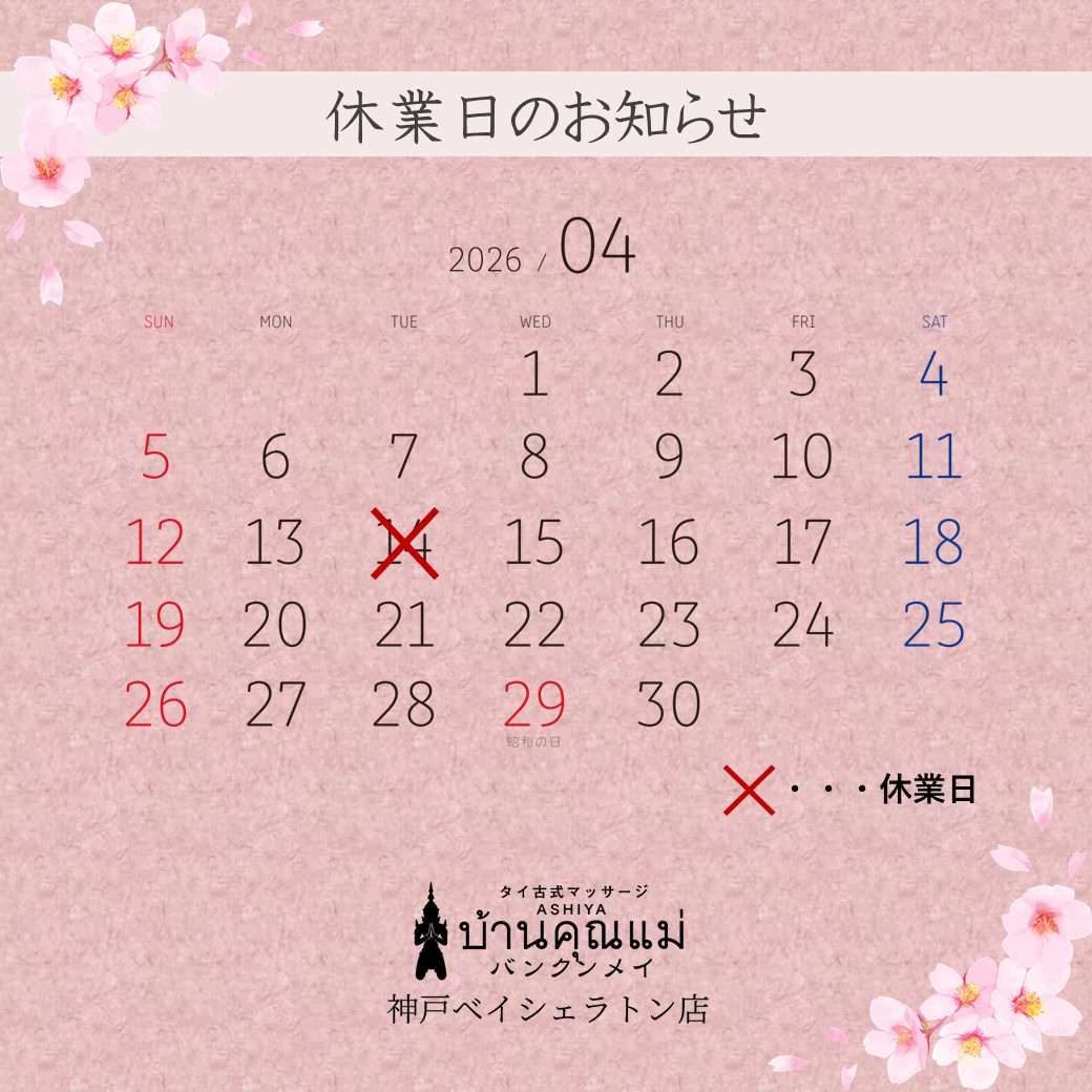 いつもタイ古式マッサージASHIYA バンクンメイ神戸ベイシェラトン店をご利用いただき、誠にありがとうございます✨